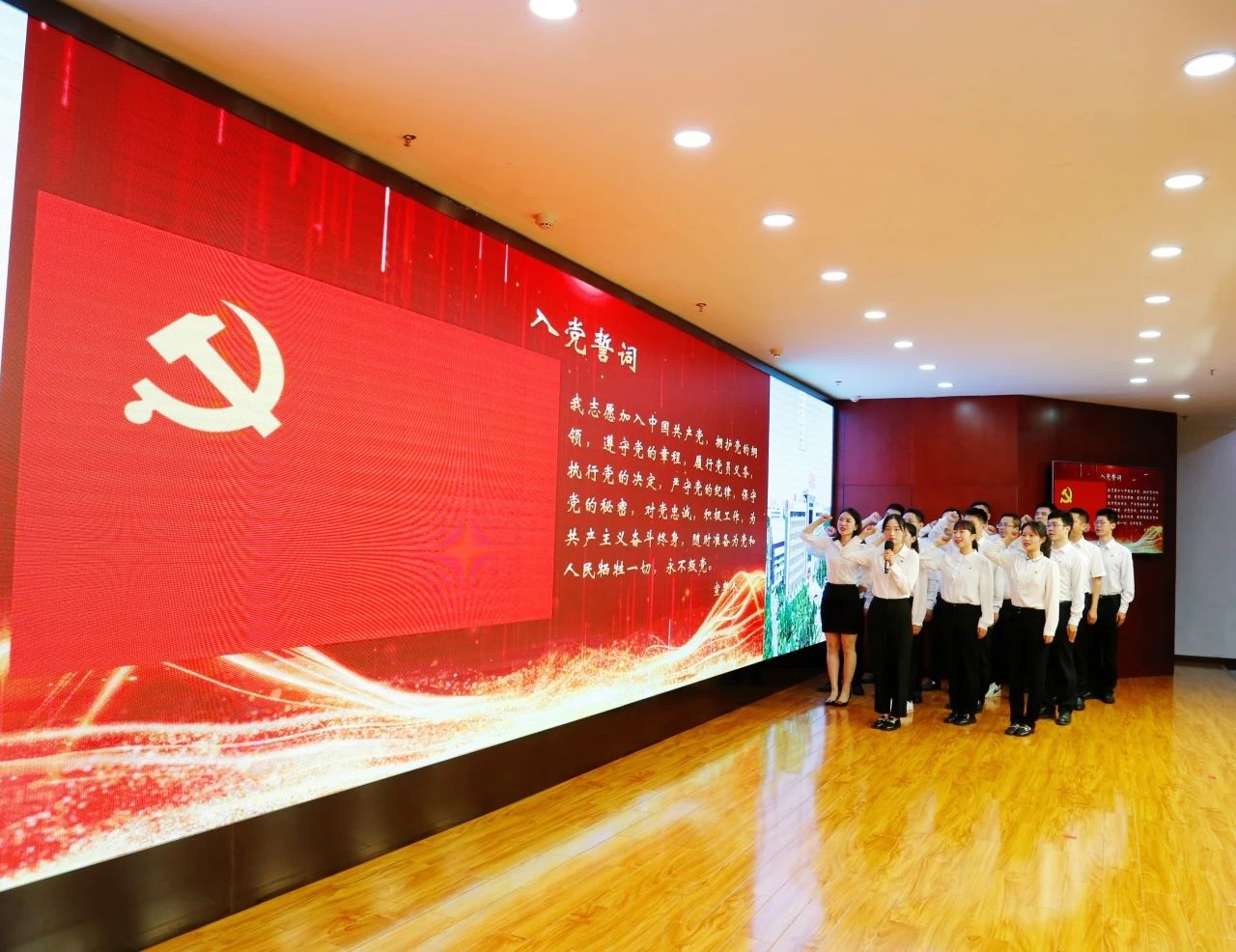 誓言錚錚,薪火相傳,面對鮮紅的黨旗,預備黨員整齊列隊,高舉右臂、緊握右拳,全場黨員一同重溫入黨誓詞,感悟中國共產(chǎn)黨人的初心和使命,表達對黨忠誠和為共產(chǎn)主義奮斗終身的決心。