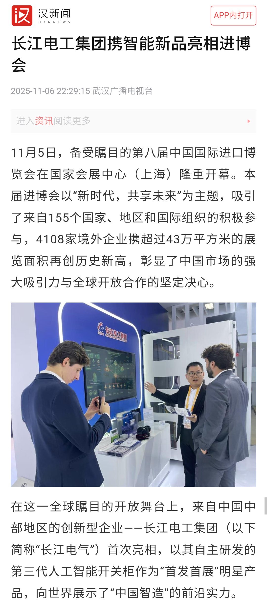 作為智能電網(wǎng)和新能源建設(shè)引領(lǐng)者,長江電工集團以“首發(fā)首展”的第三代人工智能開關(guān)柜為核心展品,攜多款自主研發(fā)成果首次亮相進博會,吸引包含中央廣播電視總臺新聞頻道、中央廣播電視總臺中文國際頻道、新華網(wǎng)、央廣網(wǎng)、中國新聞網(wǎng)、湖北日報、湖北電視臺等中央及省級媒體廣泛關(guān)注和聚焦報道。