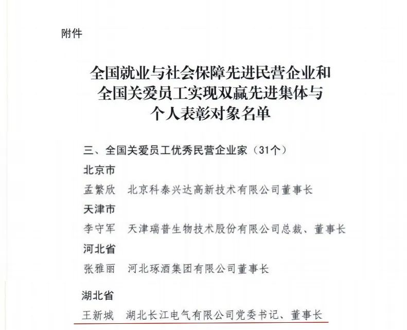 近日,中華全國工商業(yè)聯(lián)合會、中華人民共和國人力資源和社會保障部、中華全國總工會發(fā)布《關(guān)于表彰全國就業(yè)與社會保障先進(jìn)民營企業(yè)和全國關(guān)愛員工實現(xiàn)雙贏先進(jìn)集體與個人的決定》,長江電氣黨委書記、董事長王新城榮獲湖北省唯一“全國關(guān)愛員工優(yōu)秀民營企業(yè)家”稱號,長江電氣員工張作頓榮獲湖北省唯一“全國熱愛企業(yè)優(yōu)秀員工”稱號。
