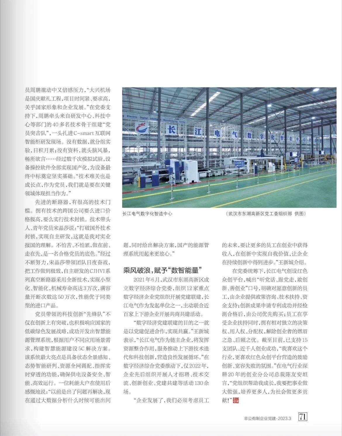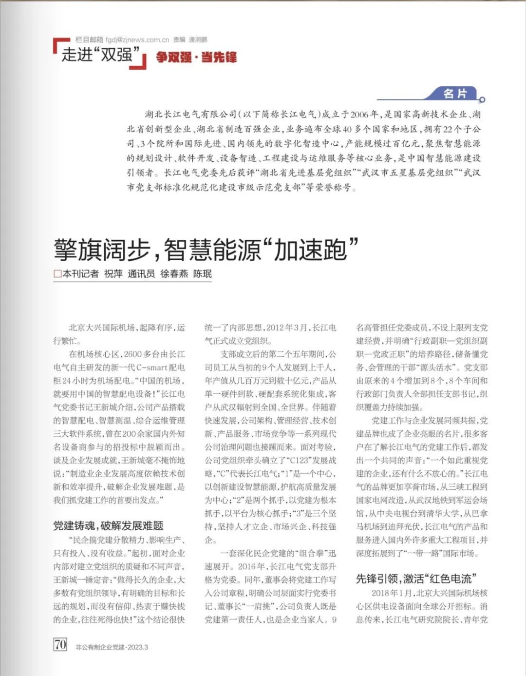 2023年3月《非公有制企業(yè)黨建》雜志,在“走進(jìn)雙強(qiáng)——爭雙強(qiáng)?當(dāng)先鋒”欄目,以《擎旗闊步,智慧能源“加速跑”》為題,聚焦報道長江電氣在“紅色電流,數(shù)智能量”黨建工作法之下,如何以高質(zhì)量黨建引領(lǐng)企業(yè)高質(zhì)量發(fā)展事跡。