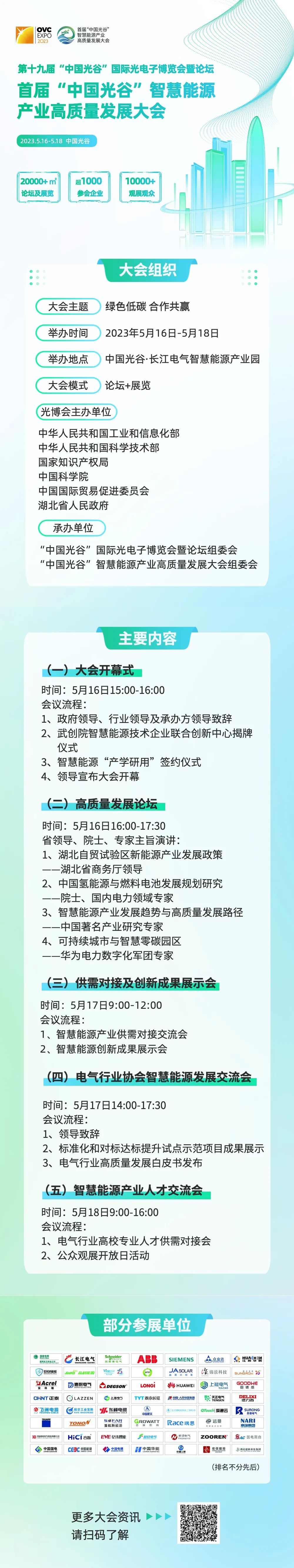 2023年5月16日至18日,首屆“中國光谷”智慧能源產(chǎn)業(yè)高質(zhì)量發(fā)展大會(huì)將在中國光谷舉行。本次大會(huì)是第十九屆光博會(huì)首次舉辦智慧能源領(lǐng)域分論壇,大會(huì)以“綠色低碳,合作共贏”為主題,旨在為政府、科研機(jī)構(gòu)、行業(yè)及用能單位搭建“共建、共享、共治、共贏”發(fā)展平臺,以數(shù)字化勾勒綠色發(fā)展藍(lán)圖,共同打造智慧能源產(chǎn)業(yè)生態(tài)圈,匯聚智慧能源產(chǎn)業(yè)發(fā)展磅礴力量。