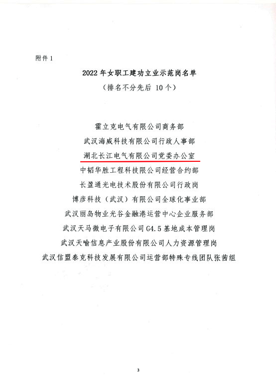 3月3日,武漢東湖高新區(qū)光電園總工會發(fā)布表彰通知,長江電氣黨辦榮獲2022 年度“女職工建功立業(yè)示范崗”榮譽稱號。