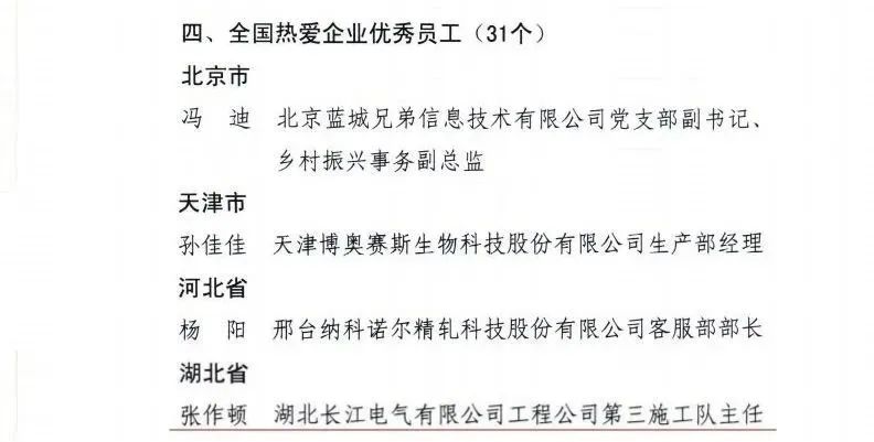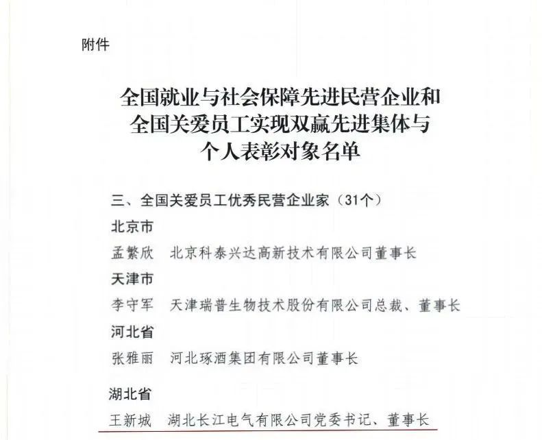 近日,中華全國工商業(yè)聯(lián)合會、中華人民共和國人力資源和社會保障部、中華全國總工會發(fā)布《關(guān)于表彰全國就業(yè)與社會保障先進民營企業(yè)和全國關(guān)愛員工實現(xiàn)雙贏先進集體與個人的決定》,長江電氣黨委書記、董事長王新城榮獲湖北省唯一“全國關(guān)愛員工優(yōu)秀民營企業(yè)家”稱號,長江電氣員工張作頓榮獲湖北省唯一“全國熱愛企業(yè)優(yōu)秀員工”稱號。